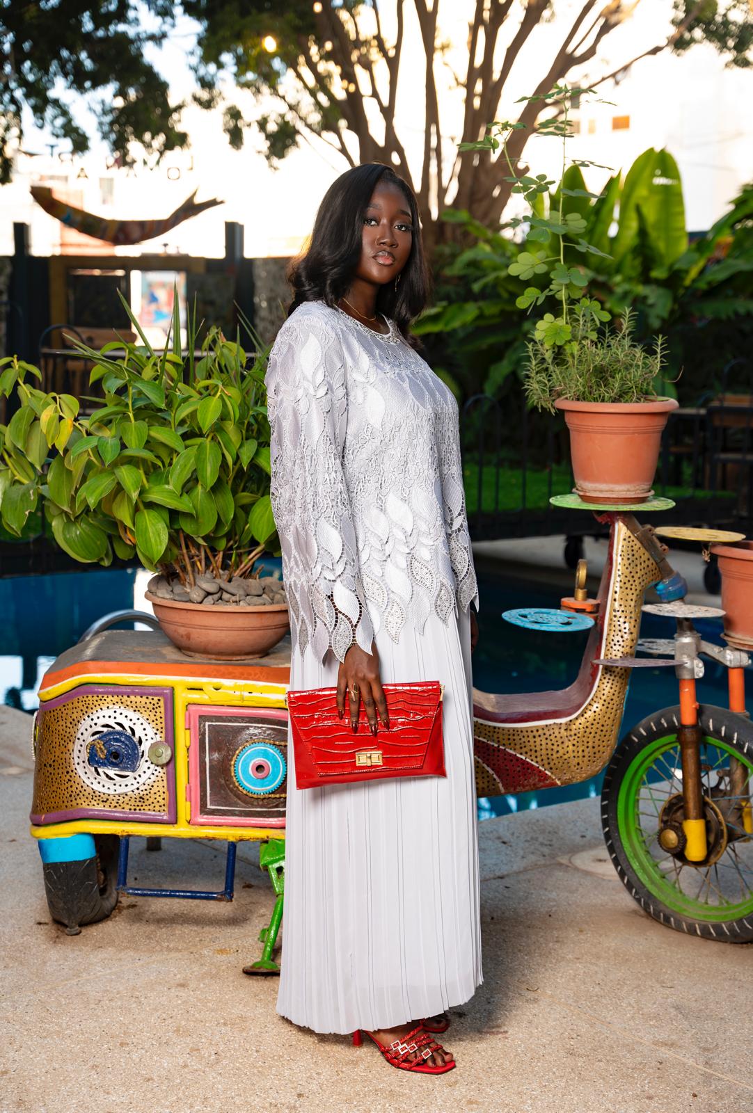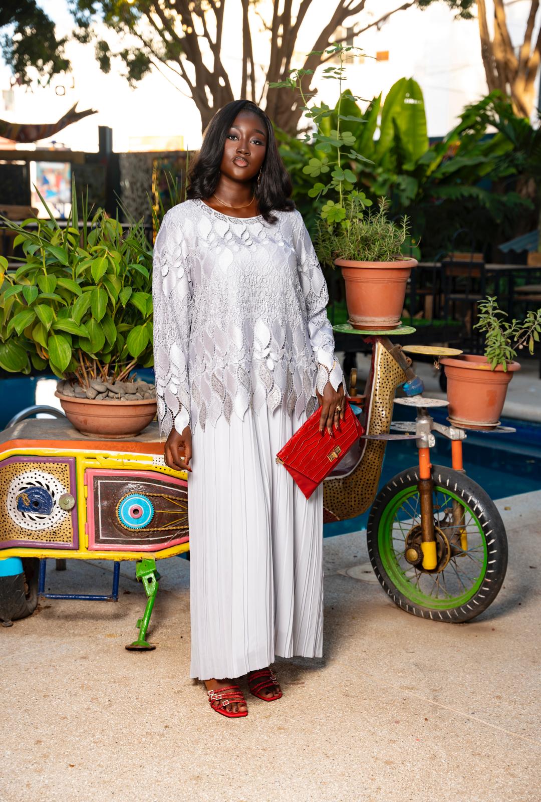 Un ensemble élégant et délicat qui marie finesse et légèreté. Le haut présente de sublimes motifs en forme de feuilles argentées, symbolisant la pureté et la féminité. Sa coupe fluide, associée à une jupe plissée blanche, crée un mouvement aérien et gracieux. Un look intemporel, parfait pour les cérémonies, les soirées ou les moments où l’on veut briller avec simplicité.