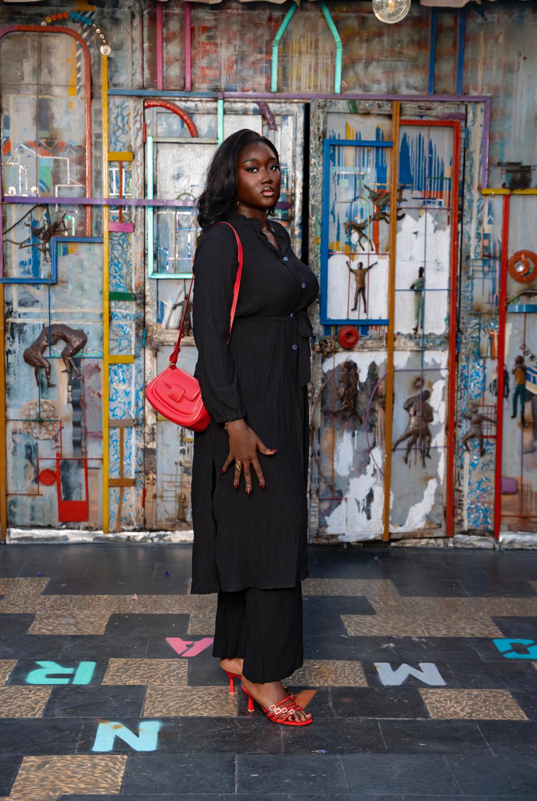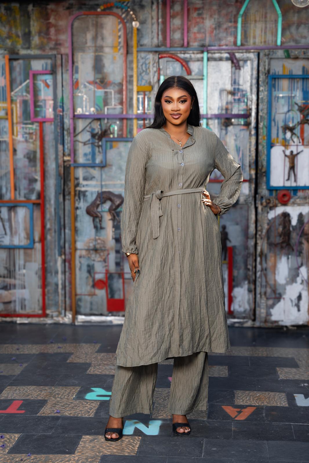 Un ensemble fluide et structuré, composé d’une chemise longue à ceinture et d’un pantalon